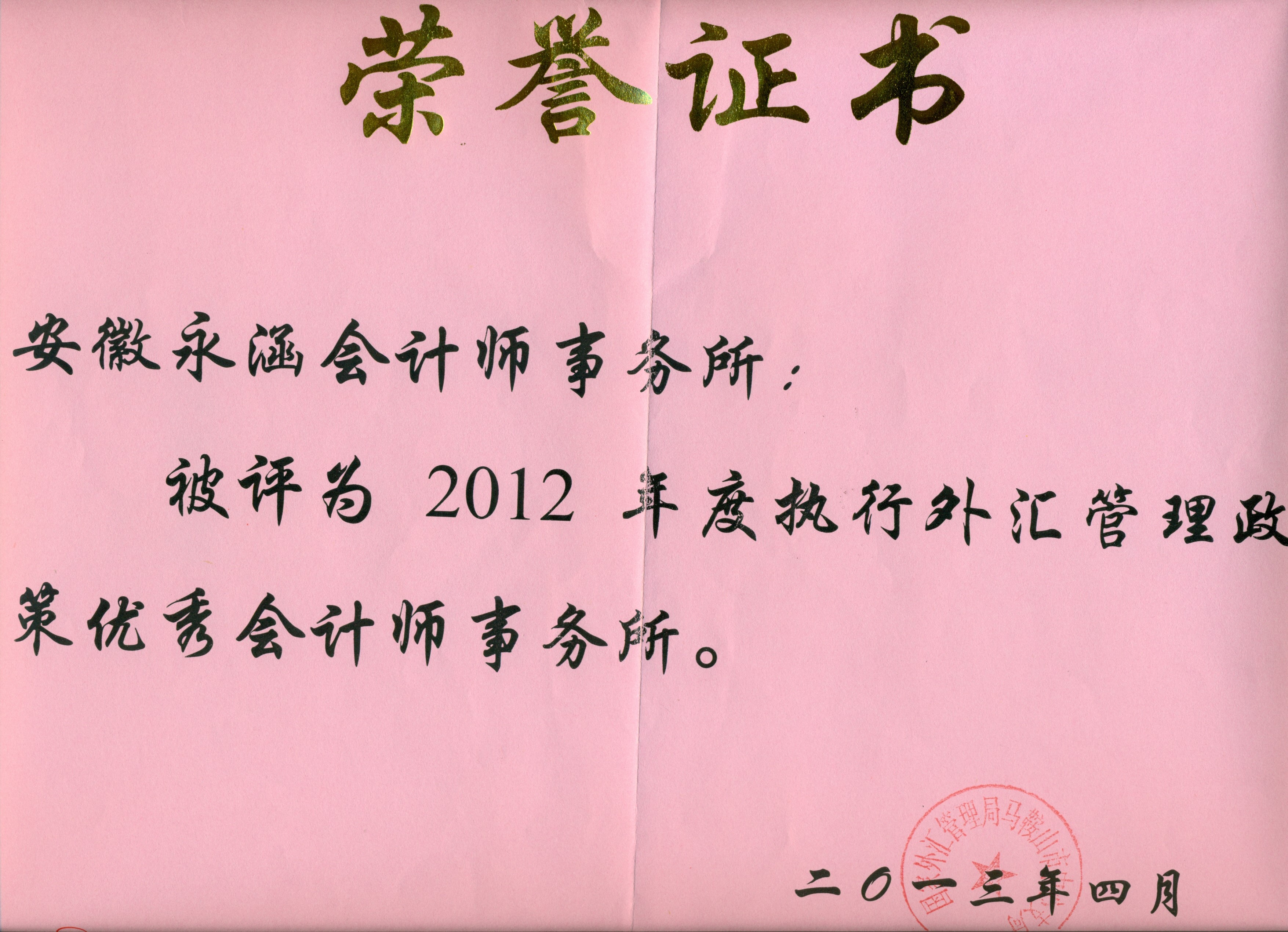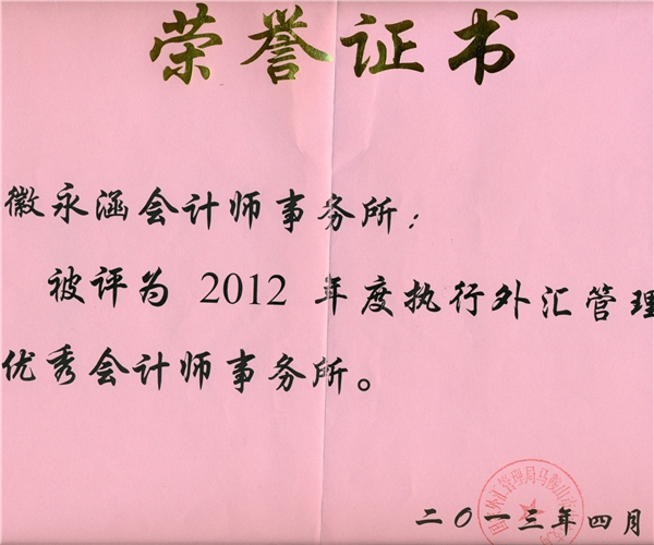 2012年度会计所荣获外汇政策优秀会计师事务所荣誉